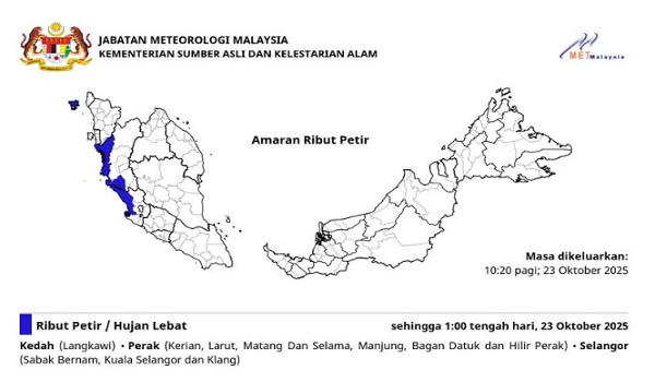Ribut petir diramal landa tiga negeri hingga 1 tengah hari